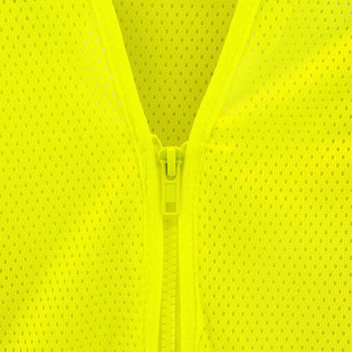 All-mesh, high-visibility surveyor vest with contrasting trim and 2 in. silver reflective tape for superior visibility; features zipper closure, mic tabs on both shoulders, and multiple pockets for tools and ID.