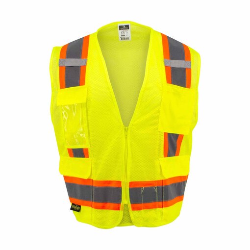 All-mesh two-tone surveyor safety vest with contrasting trim for enhanced day and night visibility. Made of 100% polyester mesh with solid polyester pockets, it features 2 in. silver reflective tape, zipper closure, mic tabs on both shoulders, and multiple pockets. ANSI/ISEA 107 Type R Class 2 compliant in high-visibility green, size Large.