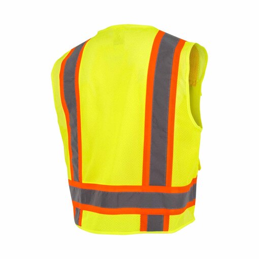High-visibility surveyor vest made of all-mesh polyester with contrasting trim and 2 in. silver reflective tape for Type R Class 2 compliance. Features zipper closure, mic tabs on both shoulders, and multiple pockets for tools and ID.
